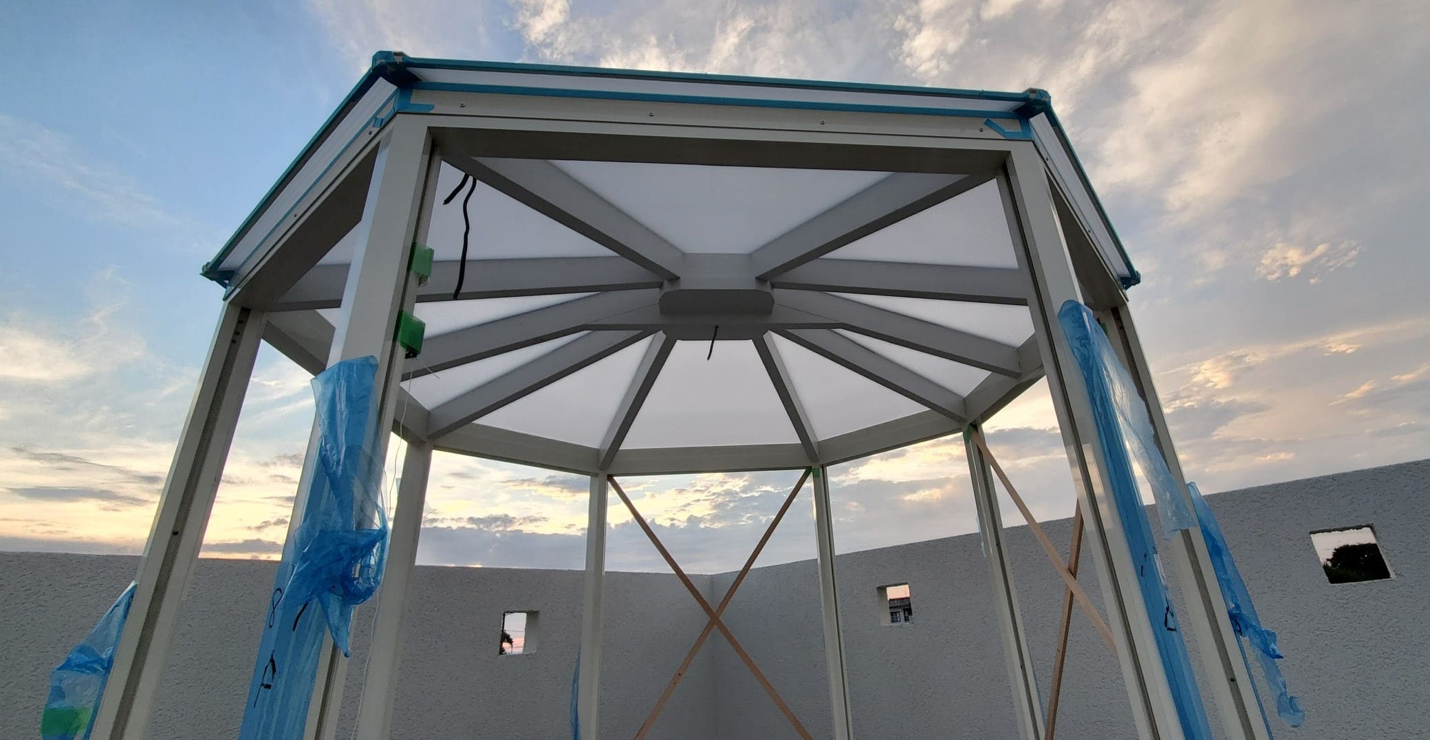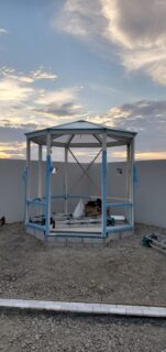 施工例 独立型‐04 静岡県 # 独立型 2022.08.10 静岡県磐田市 S様 ご自宅新築に伴いサンルームを設置させていただきました。 悠Uサンルームは既存建物への増設が多いのですが、今回は独立型(単体で建てる)のサンルームです。 立面図 135°の方立を8本使った八角形の形状をしています。 平面図 ↓ 施工中 完成