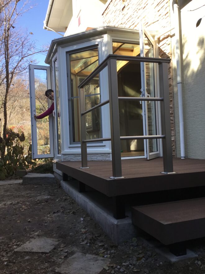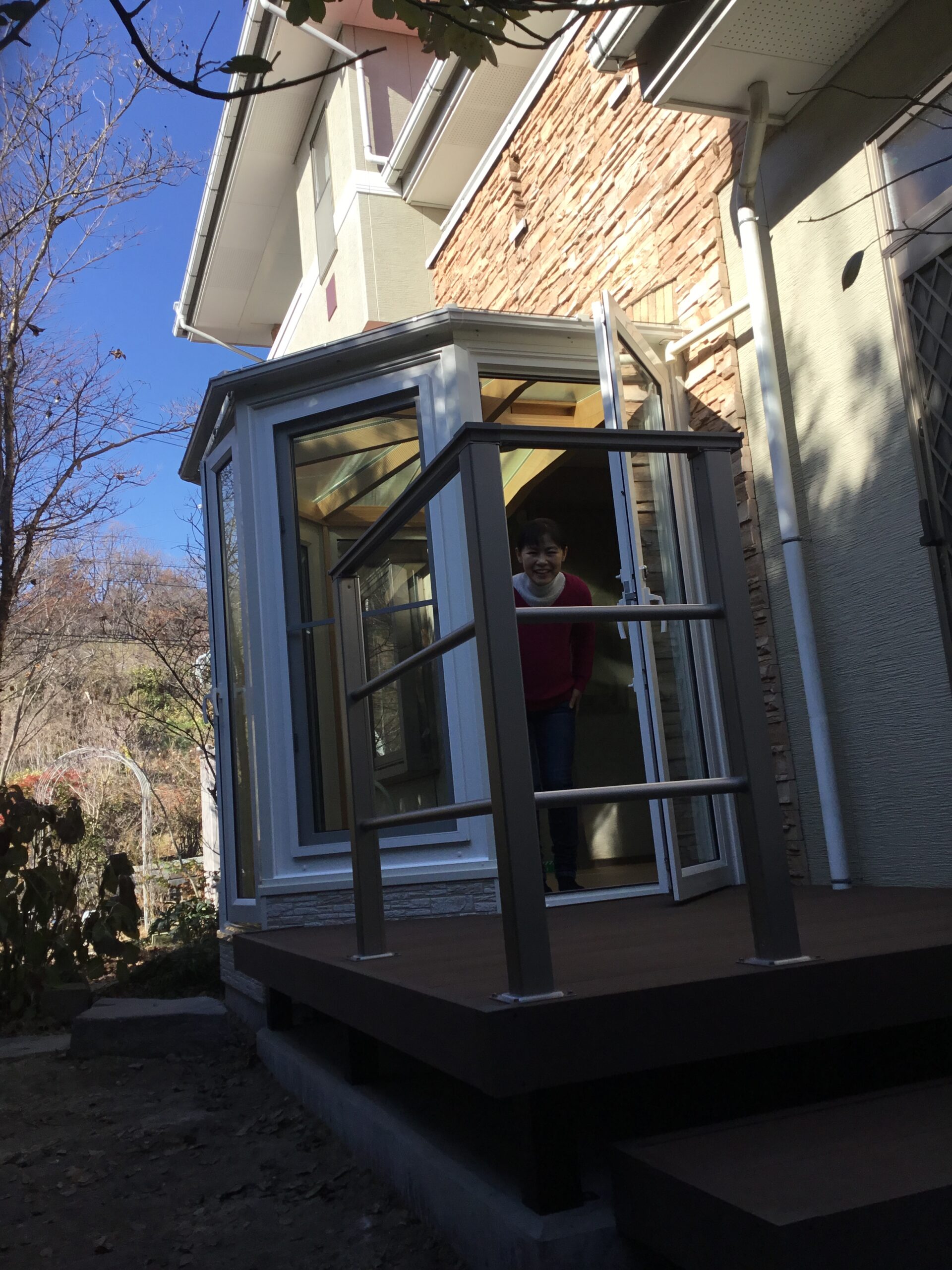 神奈川県鎌倉市 O様 高台にある住宅への設置です。 ↓ 既存のウッドデッキ上に設置しました。 サンル …