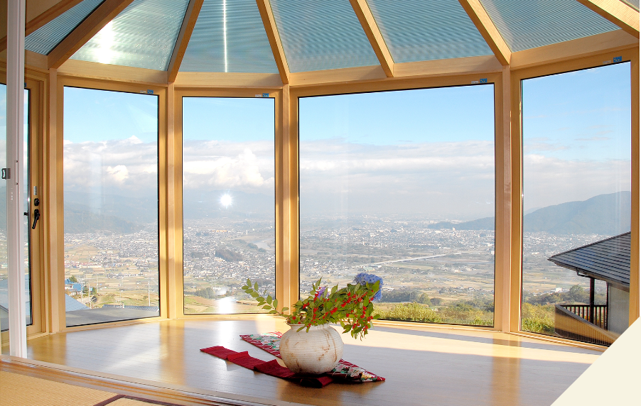 悠Uサンルームは、従来のサンルームのマイナス面を取り除いた、居住を目的として開発されたオリジナルのガラスルームです。円形・円錐形の優雅なデザイン、居住性を重視した明るく開放的な内部空間が特徴。さらに内部の木材は「木曽ひのき」が基準仕様という、世界で唯一無二のサンルームです。